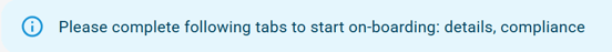 ✅ Once each section is completed, a tick will appear next to the relevant tab. The info message at the top will update to confirm that onboarding requirements have been met.